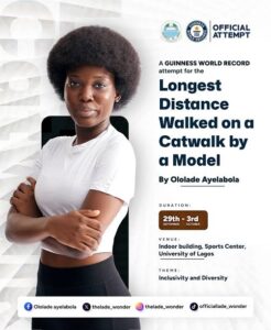 Ololade Ayelabola, estudiante de la Universidad de Lagos, se embarca en un viaje inspirador en un intento por romper el récord mundial Guinness de 41 años de antigüedad de la pasarela de distancia más larga realizada por una modelo. Después de haber caminado más de 71 horas, su determinación es alta; superar su objetivo de 96 horas parece estar a su alcance, y su pasión y propósito mantienen su espíritu encendido.
