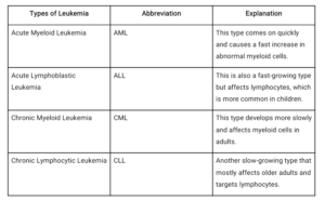 Existen cuatro tipos principales de leucemia, a saber: leucemia mieloide aguda (LMA), leucemia linfoblástica aguda (LLA), leucemia mieloide crónica (LMC) y leucemia linfocítica crónica (LLC).