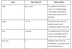 Valor diario (VD): el valor diario es la cantidad de un nutriente específico que obtiene de una porción de alimento en comparación con lo que su cuerpo necesita en un día.