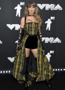 La multipremiada cantante y compositora Taylor Swift se paseó por la alfombra de los MTV VMAs con un precioso vestido amarillo y negro de cuadros escoceses. Su corpiño con cremallera se ajustaba a una minifalda negra. Los guantes largos de cuero negro, las botas hasta el muslo y la cola eran los toques finales perfectos para este conjunto estelar.