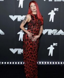 Halsey llegó a los MTV VMA empapada en un vestido de estampado de guepardo al rojo vivo sacado de los archivos de Versace de 1996. El vestido estaba adornado con pequeñas cuentas brillantes.